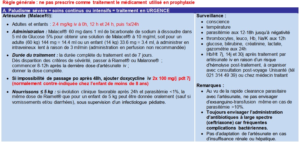 Malaria compliquée: altération état de conscience +/- crises convulsives, détresse respiratoire ou ARDS, insuffisance rénale, collapsus circulatoire